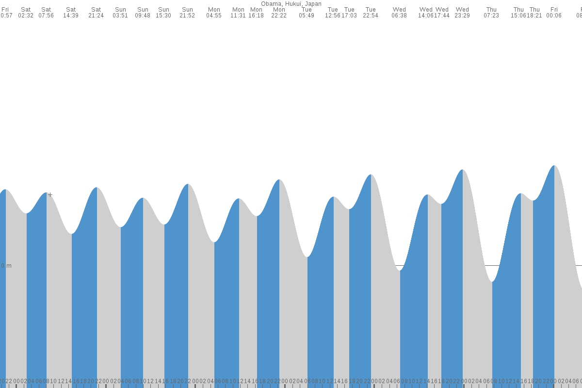 *These tide schedules are estimates based on the most relevant accurate location (Obama, Hukui, Japan), this is not necessarily the closest tide station and may differ significantly depending on distance. Please note, the low and high tide times given are not suitable for navigational purposes.