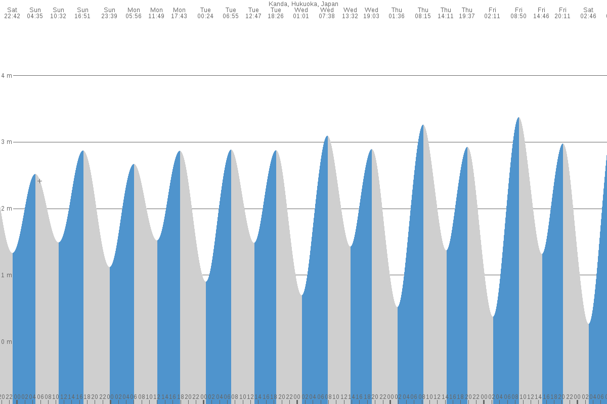 *These tide schedules are estimates based on the most relevant accurate location (Unosima, Hukuoka, Japan), this is not necessarily the closest tide station and may differ significantly depending on distance. Please note, the low and high tide times given are not suitable for navigational purposes.