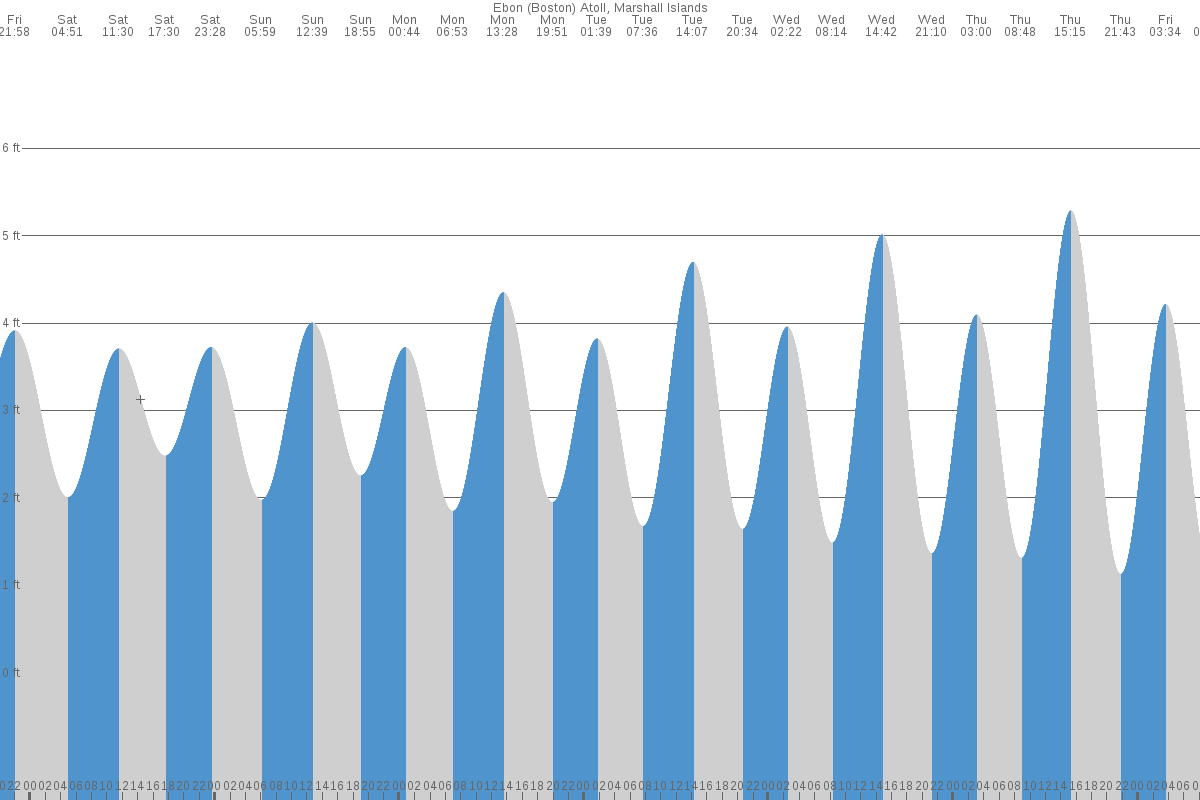 *These tide schedules are estimates based on the most relevant accurate location (Ebon (Boston) Atoll, Marshall Islands), this is not necessarily the closest tide station and may differ significantly depending on distance. Please note, the low and high tide times given are not suitable for navigational purposes.