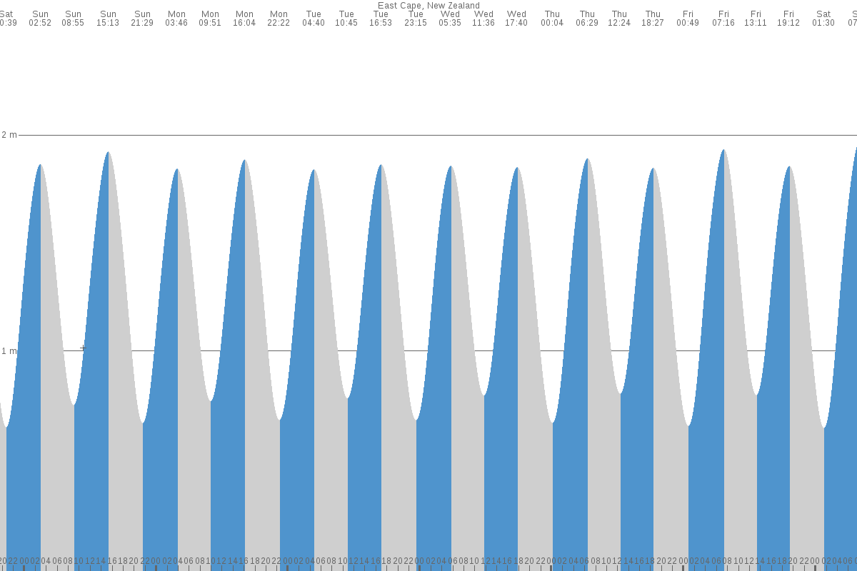 *These tide schedules are estimates based on the most relevant accurate location (East Cape, New Zealand), this is not necessarily the closest tide station and may differ significantly depending on distance. Please note, the low and high tide times given are not suitable for navigational purposes.