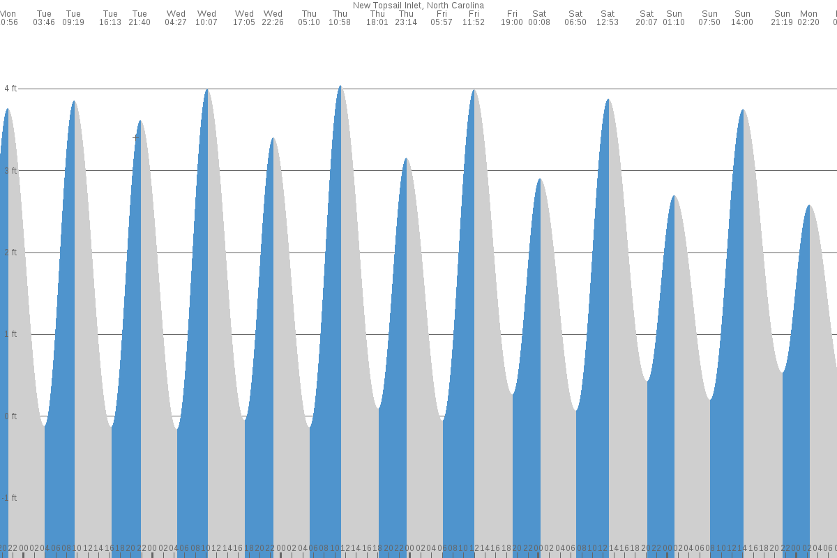 *These tide schedules are estimates based on the most relevant accurate location (New Topsail Inlet, North Carolina), this is not necessarily the closest tide station and may differ significantly depending on distance. Please note, the low and high tide times given are not suitable for navigational purposes.